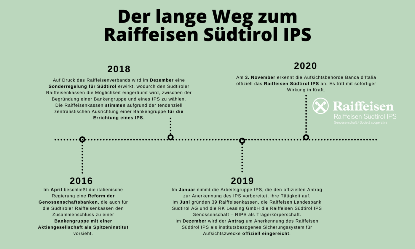 Im Rahmen der Reform der italienischen Genossenschaftsbanken im Jahre 2016, hätten sich die Südtiroler Raiffeisenkassen zu einer Bankengruppe mit einer Aktiengesellschaft als Spitzeninstitut zusammenschließen müssen. Eine Änderung des Reformgesetzes im Dezember 2018 erbrachte eine Sonderregelung für Südtirol und räumte den Südtiroler Raiffeisenkassen die Möglichkeit ein, anstelle einer Bankengruppe auch ein IPS gründen zu können.