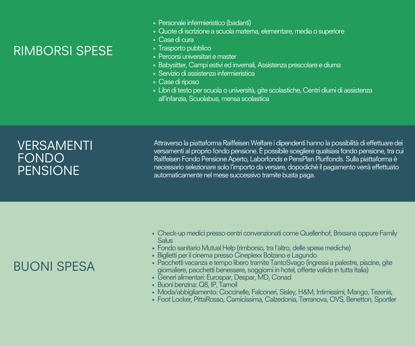 La piattaforma Raiffeisen Welfare propone diverse modalità di compensazione, tra cui versamenti al fondo pensione, rimborsi spesa e buoni/voucher. Una lista intera potetet richiedere tramite e-mail.